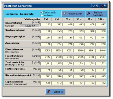 BEPRO berechnet Festbetonkennwerte für 2d, 7d, 28d, 56d,