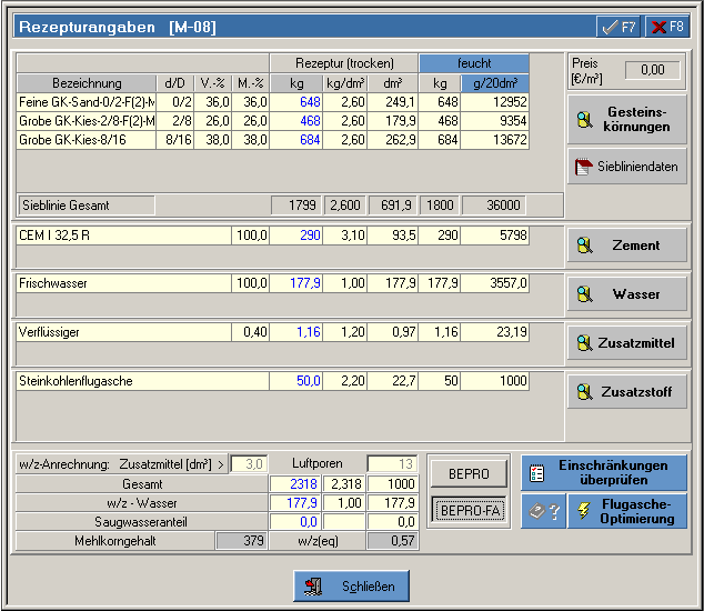 BEPRO berücksichtigt normen- bzw. anwenderseitig definierte Grenzwerte (z.B. Min- bzw. Max-Zementgehalt, maximaler