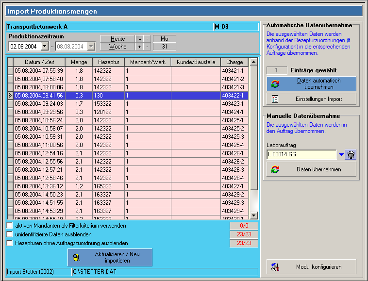 Übernahme von Produktionsdaten (produzierte Sorten, Mengen) aus Mischersteuerungen