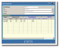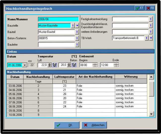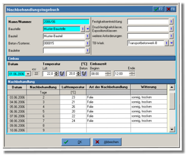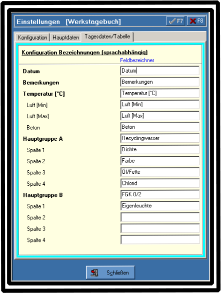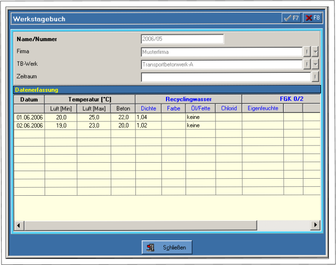TagebuchmoduleDie Tagebuchmodule dienen der einfachen Erfassung von produktionsbegleitenden Daten oder zur Dokumentation von Rahmenbe-dingungen in Produktion und Anwendung. Die Module sind sehr weitgehend konfigurierbar, um so den unterschiedlichsten Einsatz-bereichen zu genügen. Neben den Standardeinsatzbereichen als Werk-, Betonier- und Nachbehandlungstagebuch stehen zusätzliche Sondertagebücher zur Verfügung, die für individuelle Einsatzzwecke konfiguriert werden können. Die Darstellungen zeigen Beispielkonfigurationen (und z.T. entsprechende Konfigurationsdialoge). [die Bilder für vergößerte Darstellung anklicken]Werktagebuch•Das Werktagebuch dient vorrangig zur Erfassung von Produktionsbedingungen, wie Temperaturen, speziellen Stoffeigenschaften und anderen Zustandsdaten.•Aufbau: Kopfteil mit konfigurierbaren Feldbezeichnungen (maximal 4 Felder, z.B. Werksangaben)•Tabellenteil mit konfigurierbaren Spaltenbezeichnungen (maximal 13 Spalten), in 4 Bereichen (Datumsbereich, Temperturblock sowie zwei 4-spaltige Datenspalten)Betoniertagebuch•Im Betoniertagebuch werden vorzugsweise die Umgebungsbedingungen am Einbauort des Betons erfasst.•Aufbau: Kopfteil mit konfigurierbaren Feldbezeichnungen (maximal 9 Felder)•Tabellenteil mit konfigurierbaren Spaltenbezeichnungen (maximal 15 Spalten)Nachbehandlungstagebuch•Im Nachbehandlungstagebuch können die Rahmenbedingungen und die Art der erfolgten Nachbehandlung dokumentiert werden.•Aufbau: Kopfteil mit konfigurierbaren Feldbezeichnungen (maximal 9 + 5 Felder)•Tabellenteil mit konfigurierbaren Spaltenbezeichnungen (maximal 5 Spalten)Sondertagebuch•Im Gegensatz zu den obigen Tagebuchtypen sind die Sondertagebücher nicht für spezifische Einsatzbereiche vorbereitet und unterliegen der individuellen Konfiguration durch den Anwender.•Es können bis zu 3 Sondertagebücher definiert werden. •Aufbau: Kopfteil mit konfigurierbaren Feldbezeichnungen (maximal 9 Felder)•Tabellenteil mit konfigurierbaren Spaltenbezeichnungen (maximal 10 Spalten)